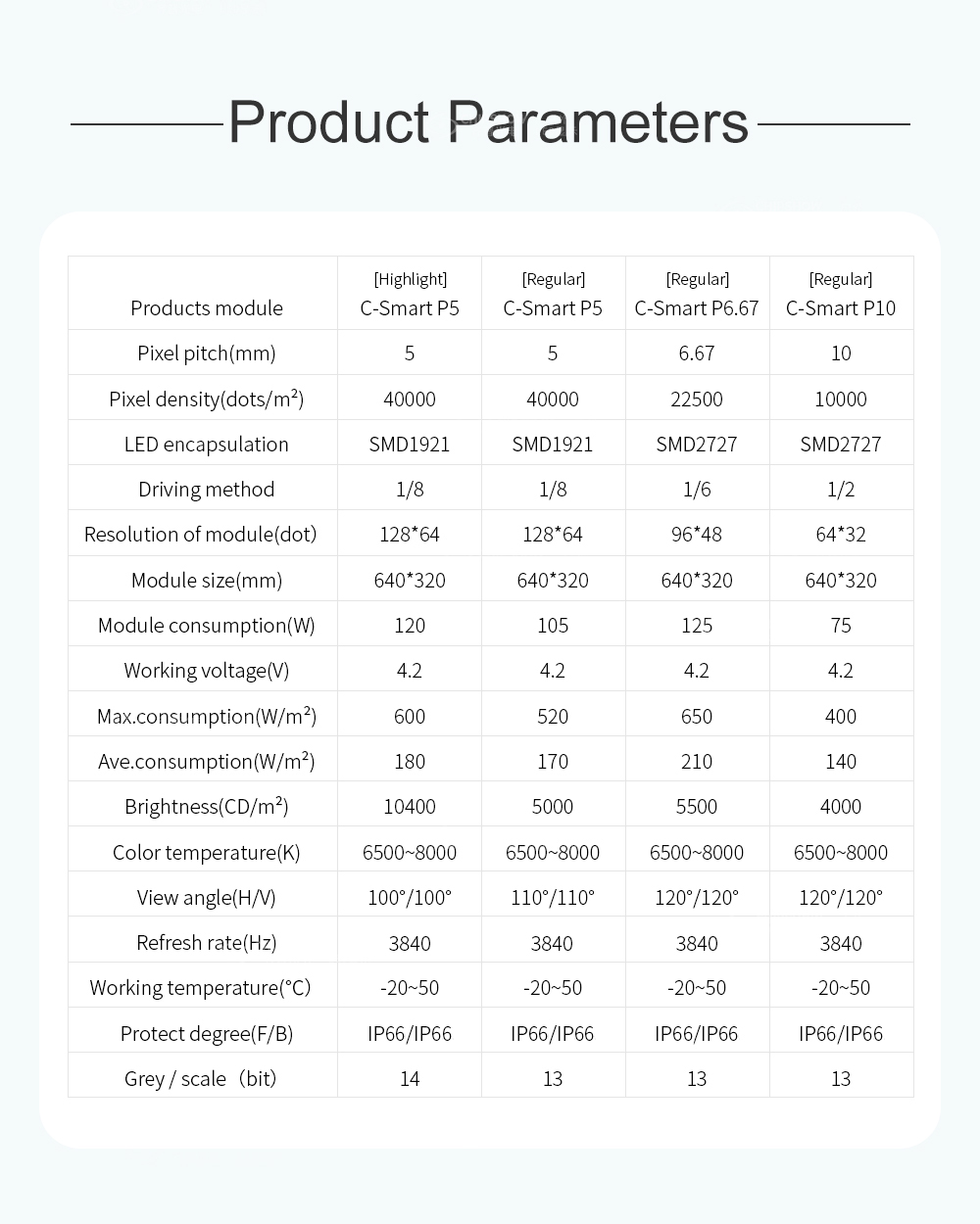 7 High-level protection: the fully-enclosed modules with a rating of IP66 ensure the screens can be seasoned to various outdoor conditions;