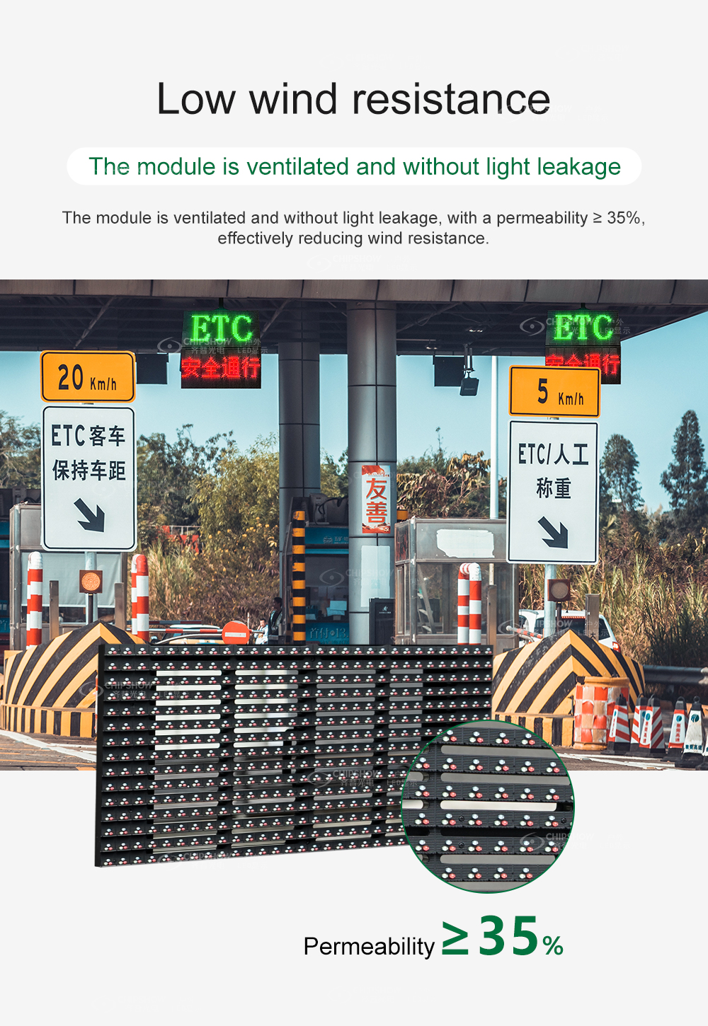 Tra-Vent combines Chipshow’s highway VMS technology with a ventilated mesh design. Engineered for toll plazas and cross-sea bridges, its hollow structure reduces wind load and cabinet weight (approx. 27–30 kg/m²), helping designers safely deploy LED signs on aging gantries and high-risk coastal structures with less reinforcement than traditional box-type VMS.