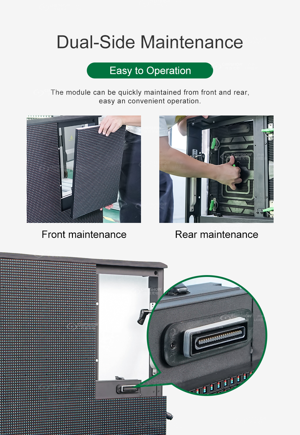 Supports front/rear maintenance and a 90° adjustable bracket to fine-tune the display angle for camera and spectator sightlines.