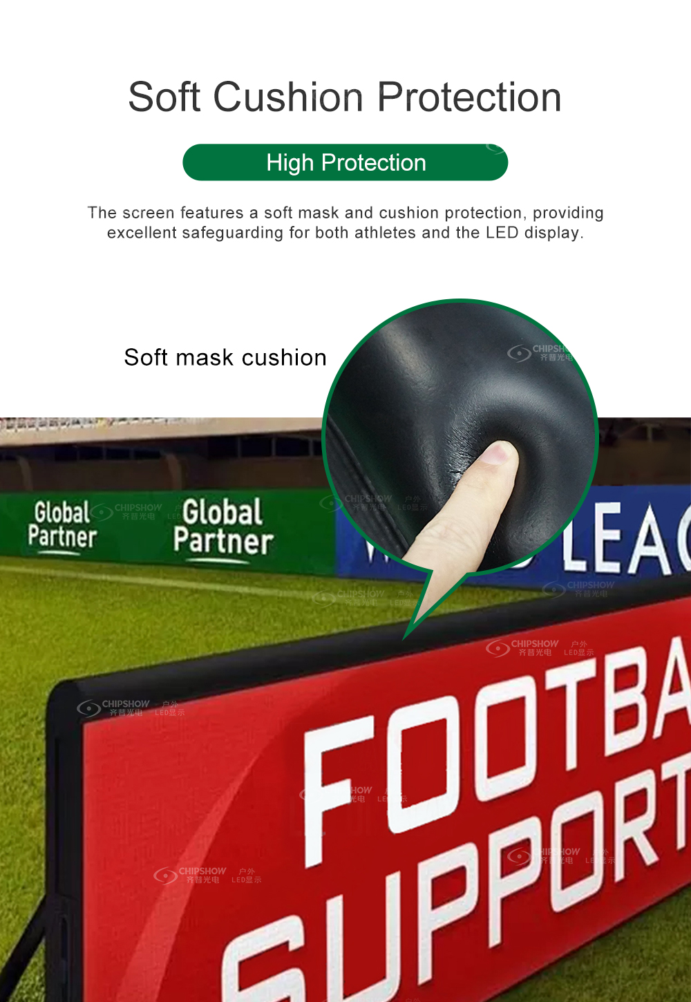 Soft mask and a top pillow cushion help absorb impact in touchline contact zones to protect athletes and the LED surface.