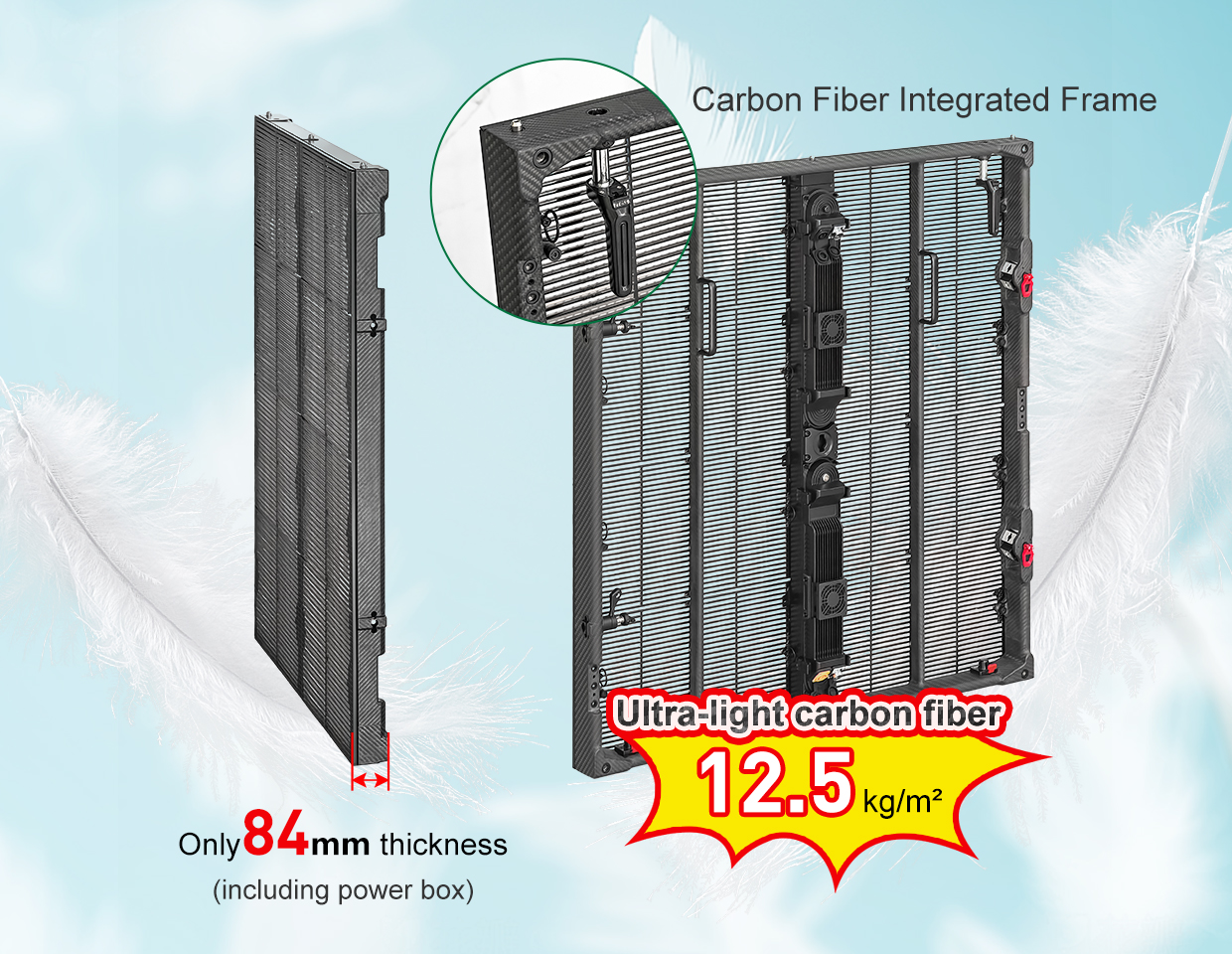 At only 12.5 kg/cabinet, it reduces truss loading and transport weight by ~40% vs traditional panels.